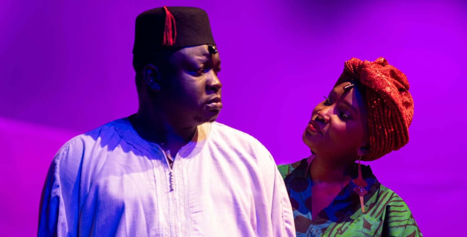 Because of the play’s deeply philosophical roots, the humour is supposed to stem from the quick-witted dialogue, not physicality or stunts. This works well in the scenes between Mtemi Bokono and his wife, Nyalwe – played by the magnificent Nyawira Alison, who, opposite the volcanic Ojuwa, is like a spotlight, shifting her movement and voice with ease, focusing her attention exactly where it is needed. The two fiery characters head-on are captivating and humorous, their repartee like the ticking hand of a clock or a boxer working away at a bag. This scene is executed perfectly.